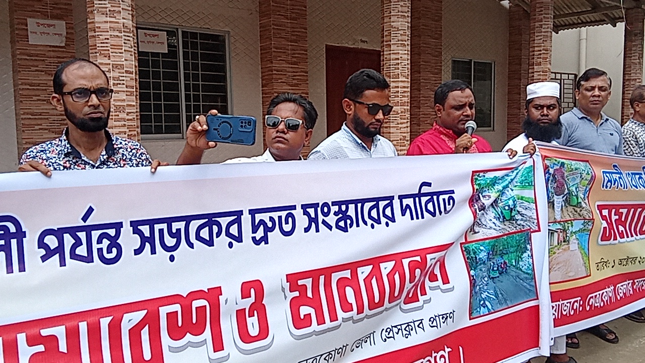 নেত্রকোনায় সড়ক সংস্কারের দাবিতে সমাবেশ ও মানববন্ধন